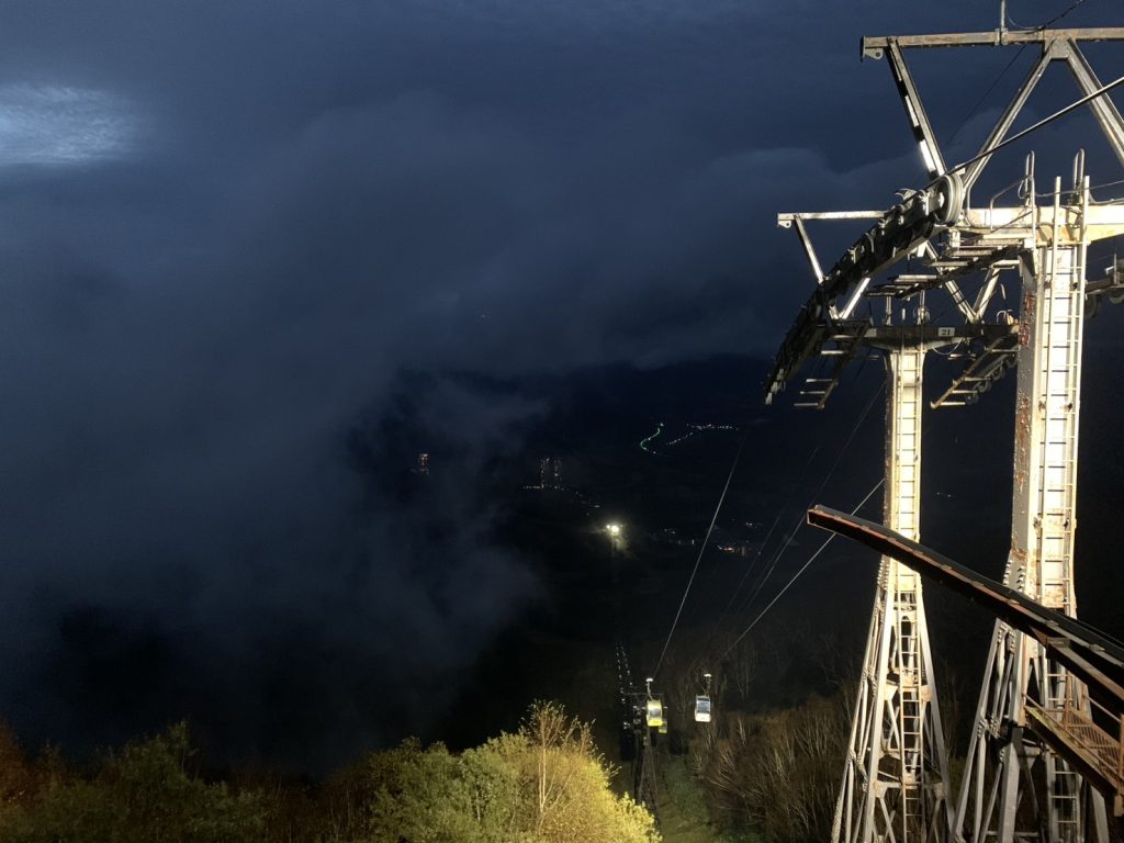 5:00前までは雲海テラスは雲に包まれており、視界は150m程度で、時折トマムエリアの灯りが見え隠れしていました。5:20頃から北寄りの風が強くなり、テラスを包んでいた雲を飛ばしていきました。秋深まった山々の所々の沢沿いには、少量の滑昇霧が発生しておりましたが、雲海の発生とまではいきませんでした。6:30頃から西から大量の雲が流れ込んできて、雲海テラスを包んで行きました。