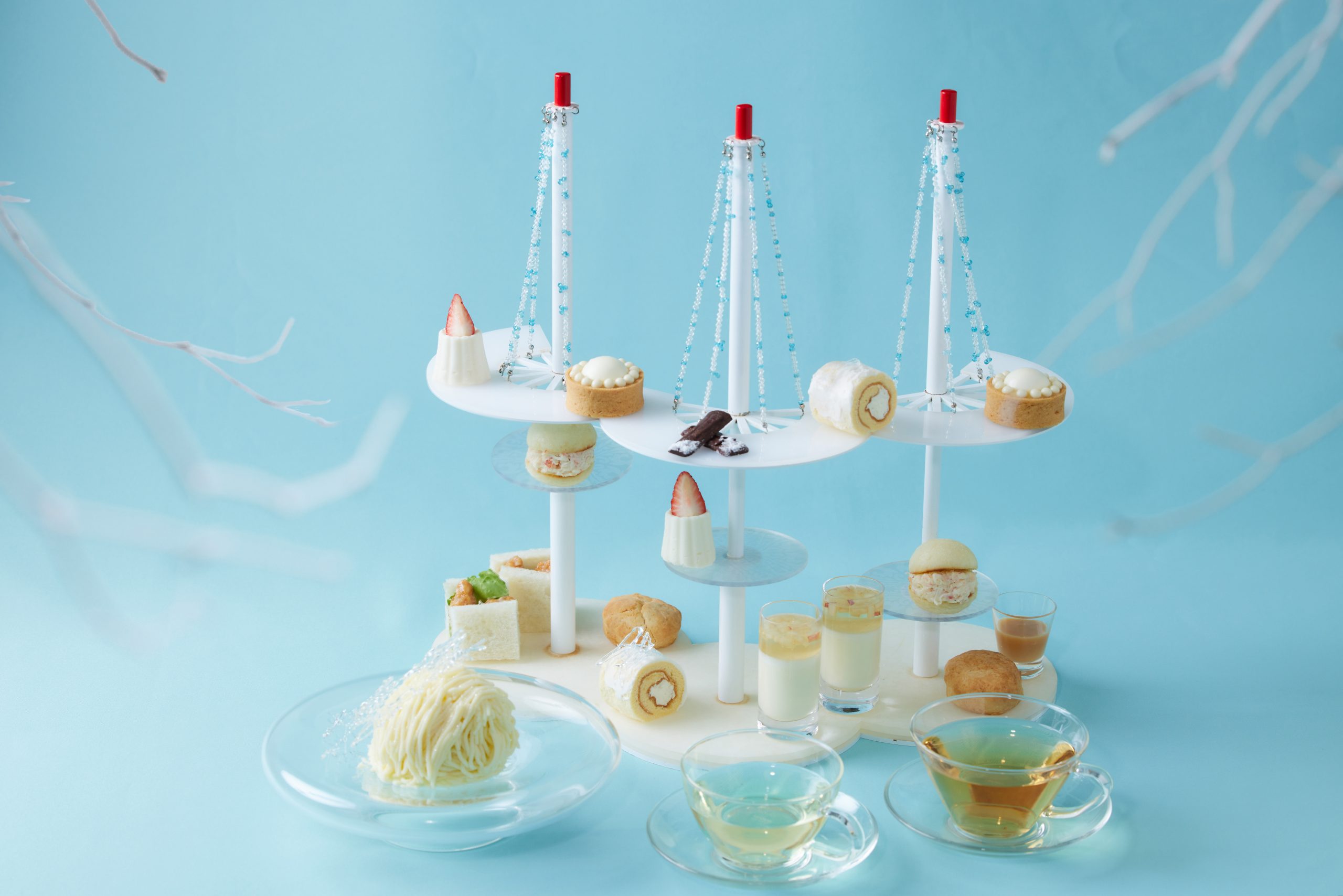 山麓から雲海ゴンドラ1本でアクセスでき、気軽に楽しめる冬のトマムの絶景体験。霧氷や雪山をイメージした全9種の小菓子やセイボリーを提供する、霧氷テラスアフタヌーンティー。絶景を眺めながらホッと一息。※要予約