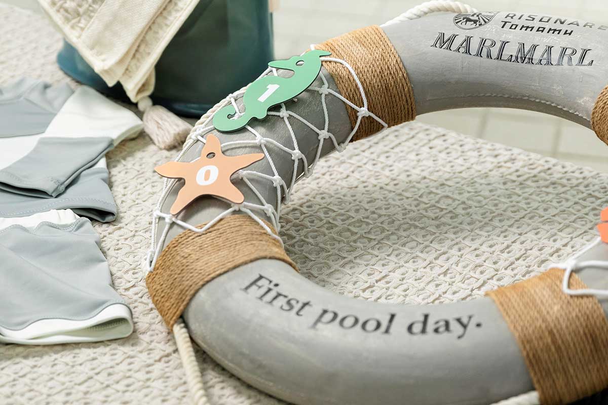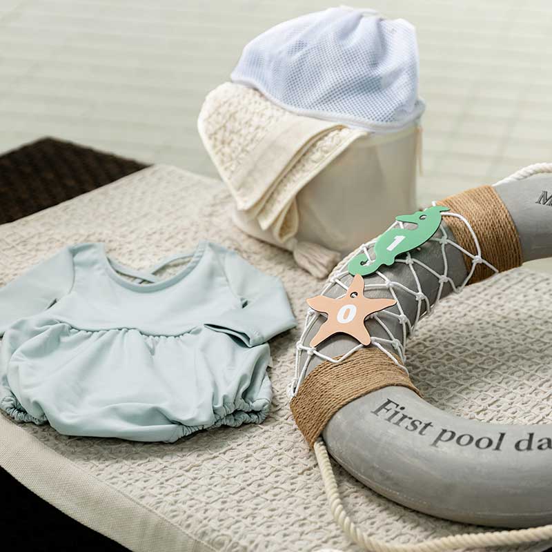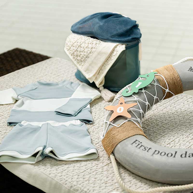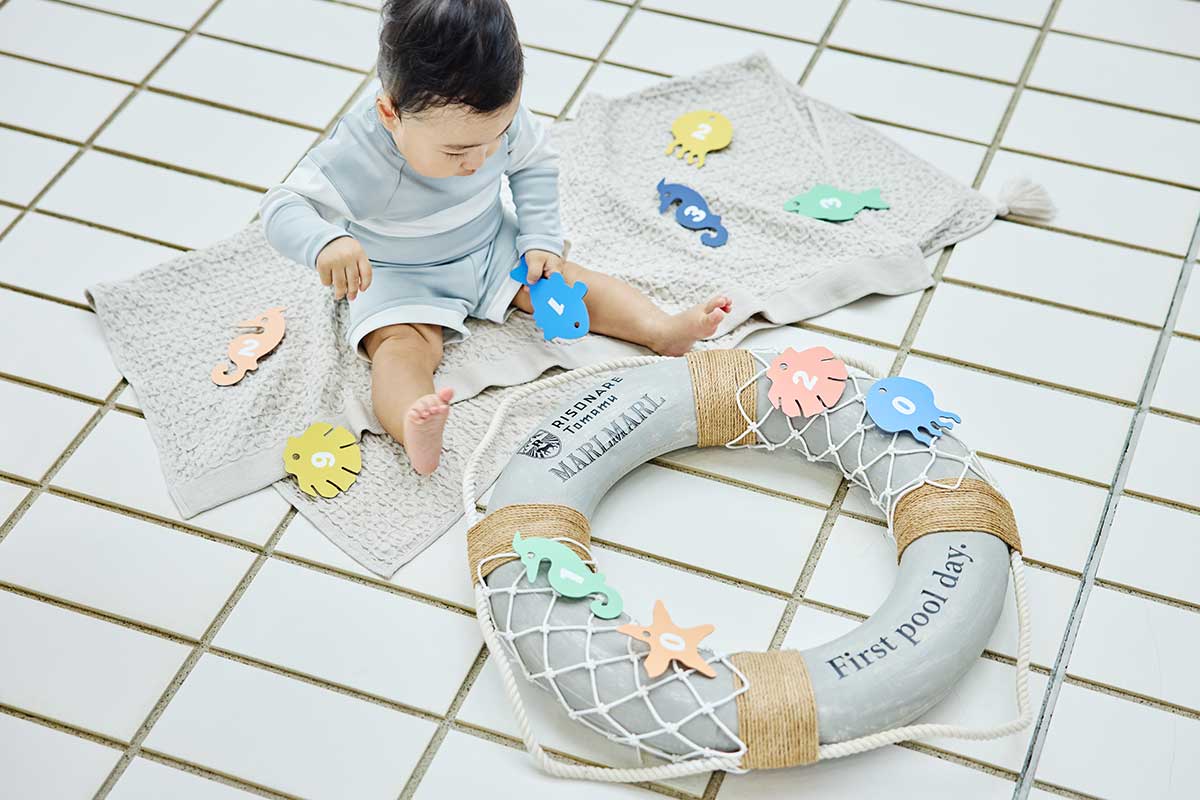 商品をご購入のお客様には、MARLMARLデザインの撮影用プロップスをお貸出し。浮き輪型の小物には「1st Pool day」の文字や、当日の日付を記した貝や魚のモチーフが飾られ、おしゃれにデビューの日を記念に残すことができます。