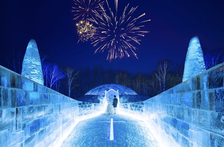 「2人の純粋な気持ちが、途切れなく続く」という想いを込め、継ぎ目 のない一枚氷で造られるのが氷の教会です。祭壇、十字架、バージンロー ド、イスなどすべてが氷と雪でできています。