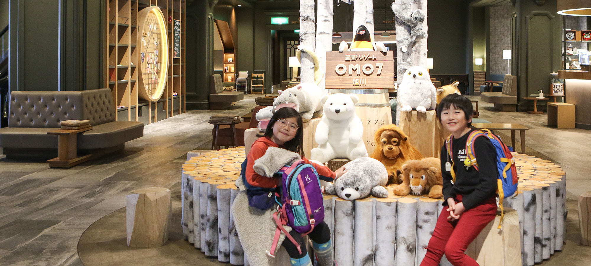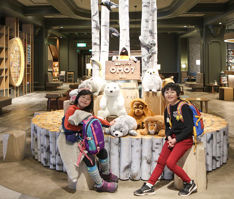ホテルのロビーに入ると旭山動物園で会える動物たちのぬいぐるみが飾られていて、テンションの上がる子供たち。今回の滞在は旭川市街地にある『OMO7旭川 by 星野リゾート』。ビジネスホテルが多数並ぶ旭川において、「都市観光」をテーマとしたこのホテルは、旭川と周辺の観光地を遊び尽くすサポート体制万全のホテルなのです。ただ泊まるだけではない、OMO7旭川のさまざまな提案を体験する2泊3日の始まり始まり!