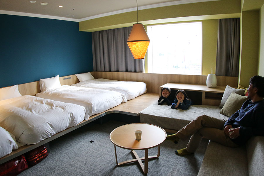 チェックインを済ませ、エレベーターで14階へ。里山暮らしの子供たちにとって、エレベーターや高層ビルも非日常のアトラクションのよう。用意されたお部屋は2020年春にリノベーションされ誕生した「ファミリールーム」。ビジネスホテルではなかなか設定のない、5名定員の広々としたお部屋で、ファミリーやグループ旅行にオススメです。トランクなど旅行カバンはベッドの下に収納ができ、荷物の多いスキー旅でも快適に過ごせる工夫が随所に施されています。
