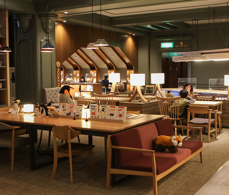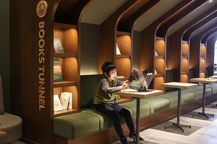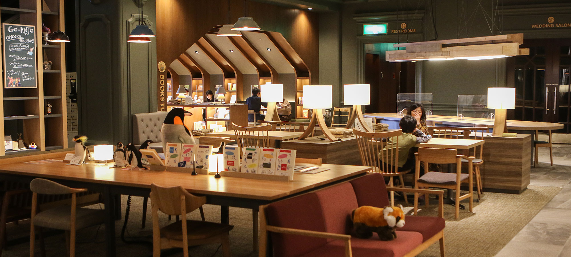 1階のロビーやラウンジは、それぞれが悠々自適に過ごせるパブリックスペース。椅子は木のぬくもりがやさしい旭川家具、ランプシェードには「旭川ラーメン」のどんぶり、「ブックトンネル」には北海道や旭川にゆかりのある本が並び、地域の魅力をあちこちで発見できます。ヒュウジとミソラは、木製のオセロで対戦したり絵本を読んだり、お父さんは合間時間にデスクワークをし、お母さんは地元作家のクラフトが素敵な売店をのぞきと、思い思いに過ごしていました。