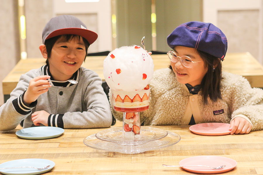 1階の「OMOカフェ&バル」に立ち寄り、「もっと苺とフレッシュクリームのパフェ」をオーダー。予想を上回る大きさにびっくりしながらも、家族4人でペロリ。