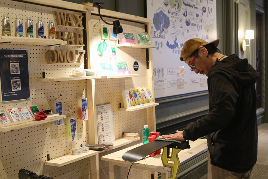 お父さんは、明日のスキーに向けてワックスがけを始めました。そう、OMO7旭川には、ワックスをかけるスペースまで用意されているのです。雪質や雪温によって選べる30種類のスノーワックスが無料で利用できるとあって、お父さんも張り切って家族みんなのスキー、スノーボードをお手入れ。近郊にスキー場が点在する、OMO7旭川ならではのスキーヤー、スノーボーダーに優しい取り組みのひとつなのです。