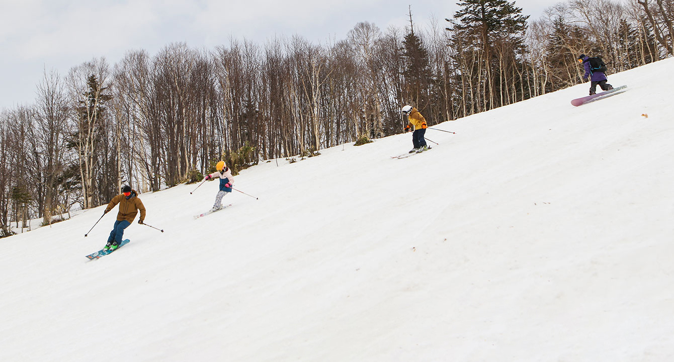 カムイスキーリンクスは、超ワイドな一枚バーンから、森の中を滑れるツリーランコース、緩やかなファミリーゲレンデなどコースバリエーション豊富。この日は、春の営業終了が近く、一部のコースしかオープンしていなかったけれど、北海道の雄大な景色を眺めながら気持ちよく滑走しました。