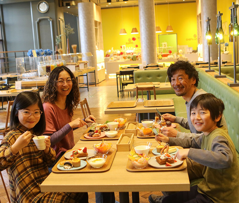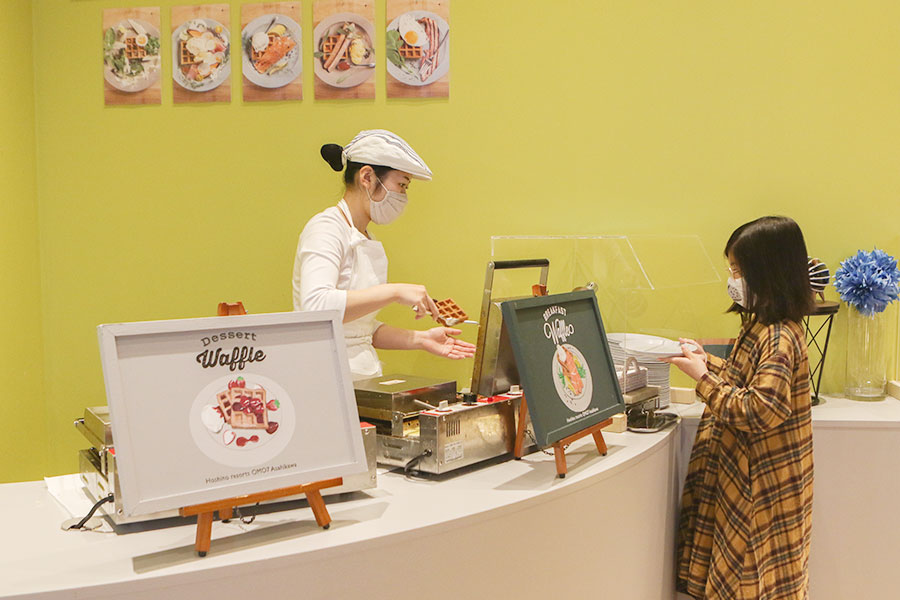 ヒュウジは色とりどりのドリンクに目移りしながら、ミソラは焼きたてのワッフルに、何をトッピングするか個性を光らせて。お父さんは、道民が愛するご飯のお供「山わさび」をトッピングする「ローストビーフ山わさびごはん」をチョイス。目の前で擦ってくれる山わさびは新鮮そのもの。お母さんは、とても全種類は食べきれないほどあるスイーツパンを楽しそうに選んでいました。