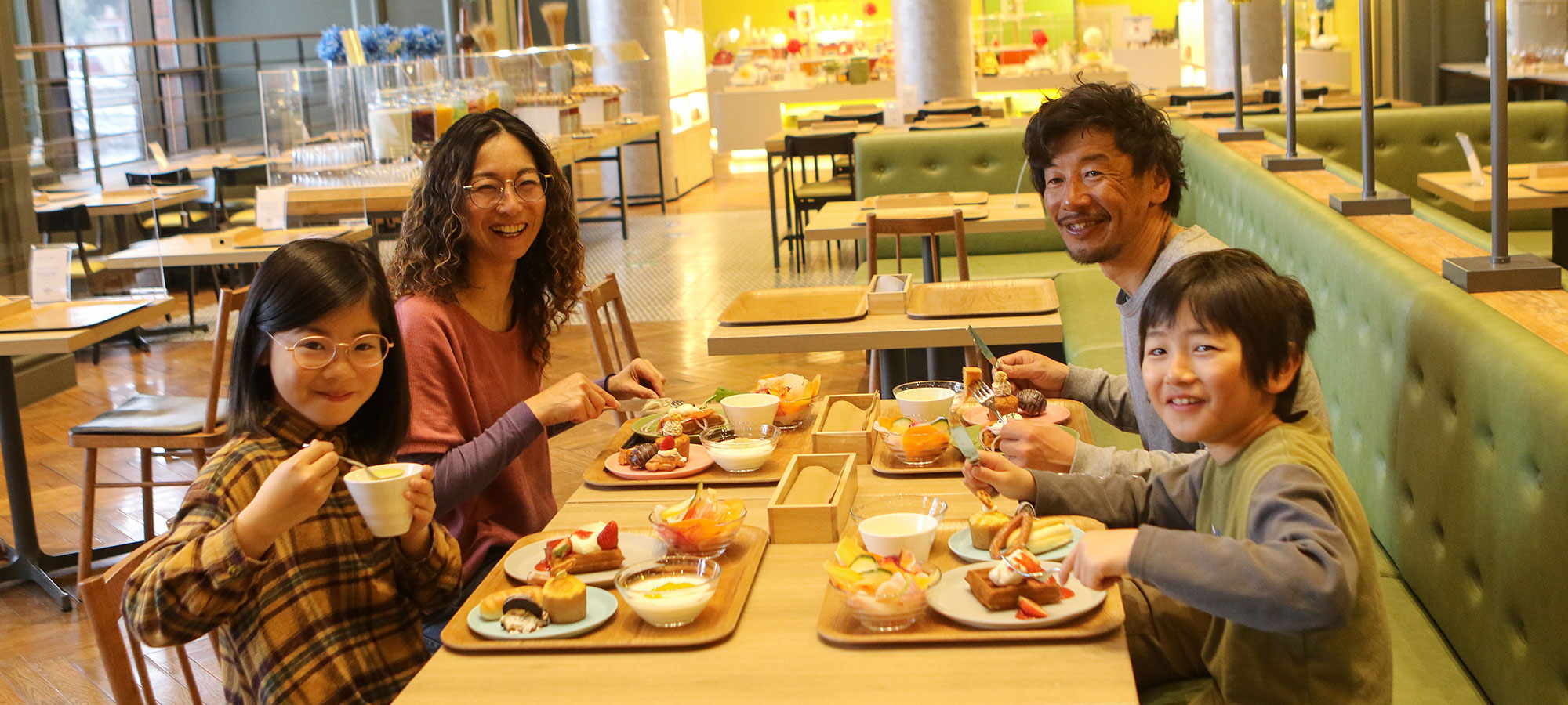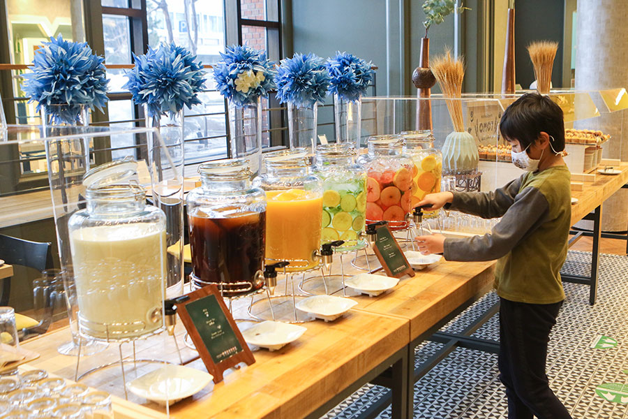 朝からテンションの上がる子供たち、だけでなく、お母さんも目を輝かせています。OMO7旭川の朝食ビュッフェのテーマは「北海道の美しい朝食」。スキーやスノーボード旅のホテルステイで、ビュッフェスタイルは定番だけれども、ここまで種類豊富に並ぶビュッフェは珍しいのでは。