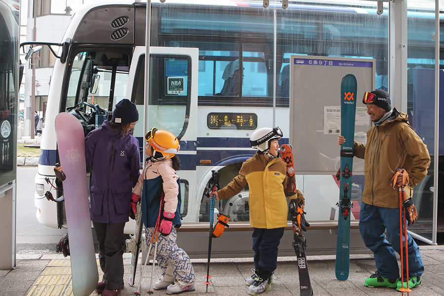 普段バスに乗る機会の少ない古瀬ファミリー、スキーブーツでバスに乗るという日常にはないシチュエーションを味わっています。