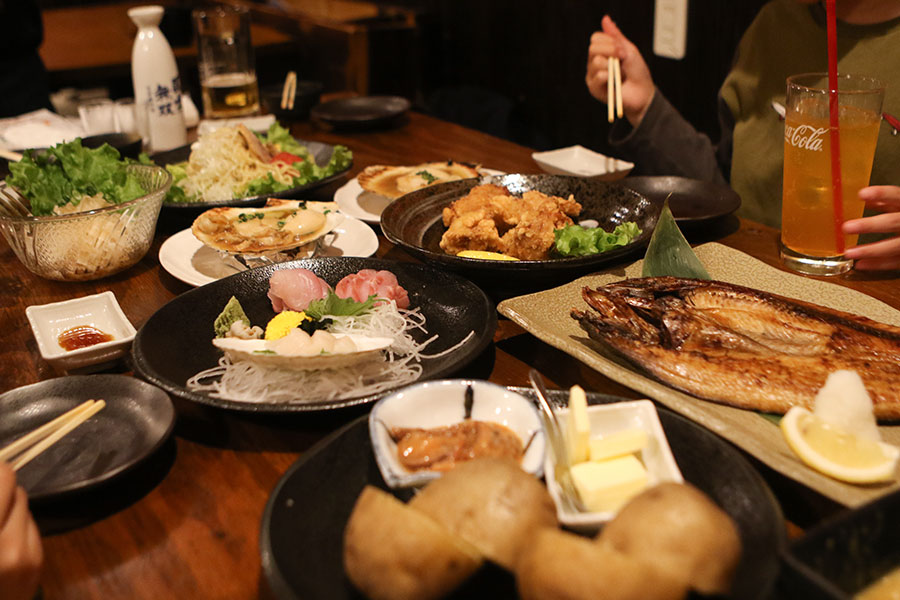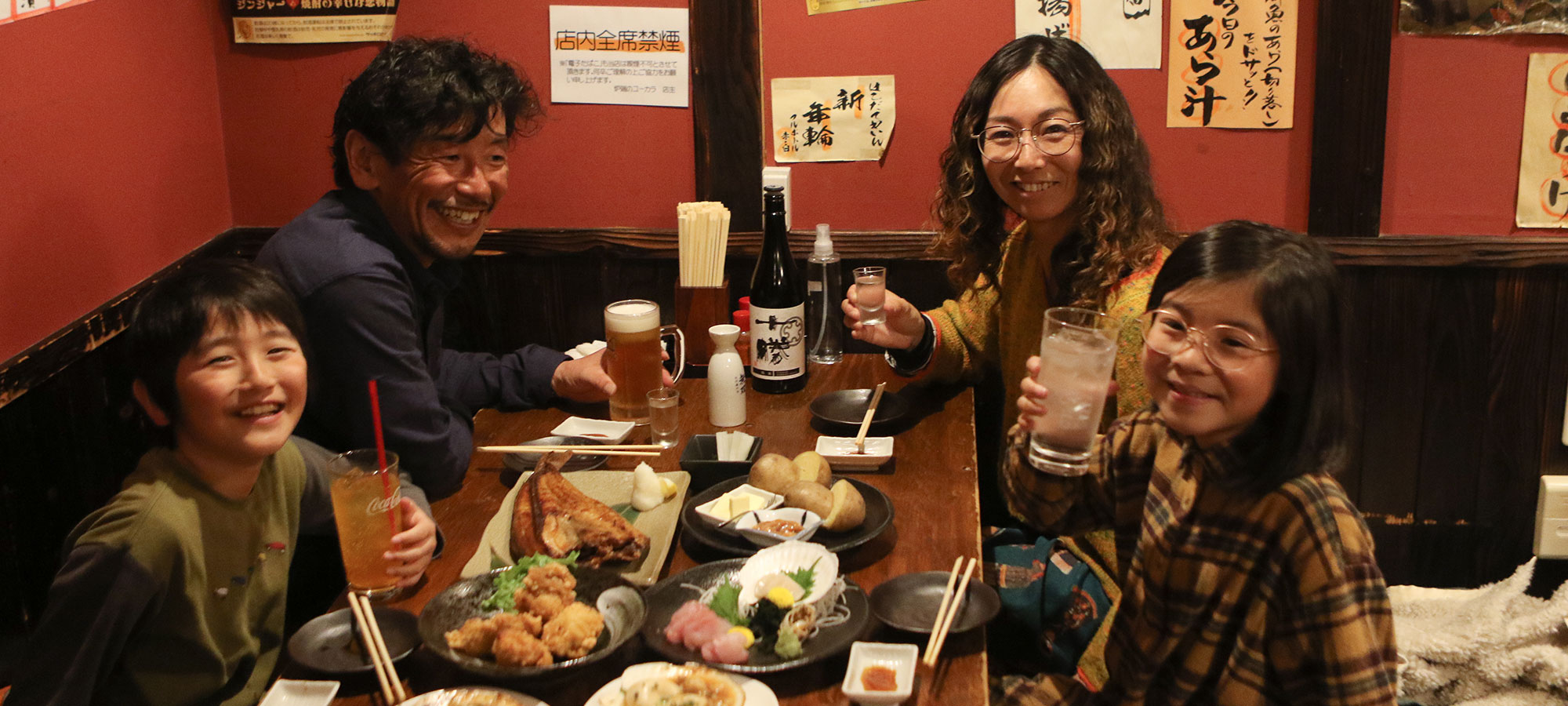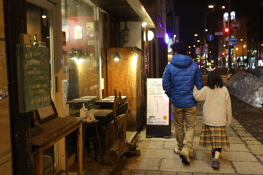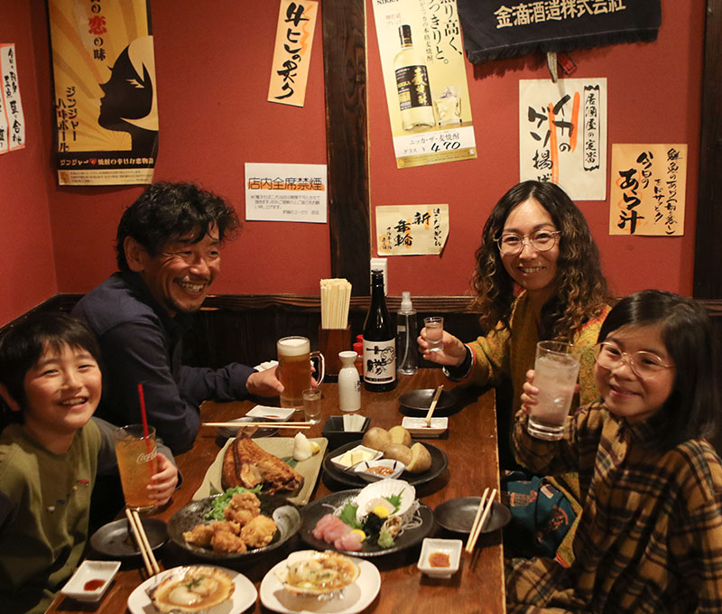 炉端で焼き上げる名物しまほっけに、北海道発祥のラーメンサラダ、じゃがバター、ザンギ(鳥の唐揚げ)、刺身盛など、まさに北の大地を代表するフルコースを堪能しました。旭川の地酒飲み比べも忘れません!お父さんはヒュージにお酌してもらったり、ミソラと腕を組んで夜の街を歩いたり。一緒にスキーも最高だけれど、こんな特別な夜も家族の思い出の1ページに刻まれるはず。