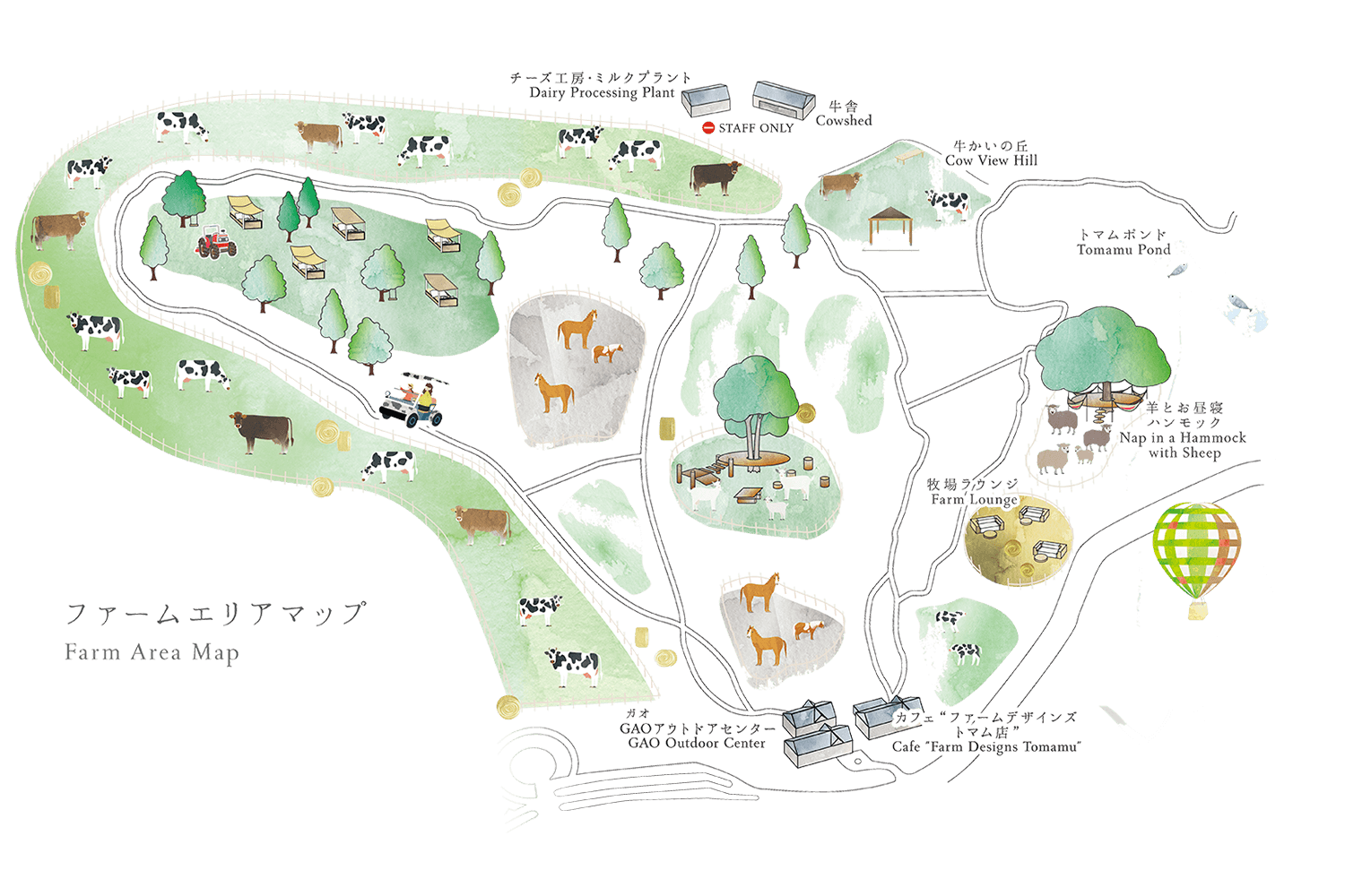 トマムは、リゾートとして開発されるまで約700頭の牛を飼育し、農業が営まれていたエリアでした。当リゾートでは、この土地が本来持っていた美しい風景を訪れた方にも楽しんでいただきたいと考え、約100ヘクタールのファームエリアを運営しています。