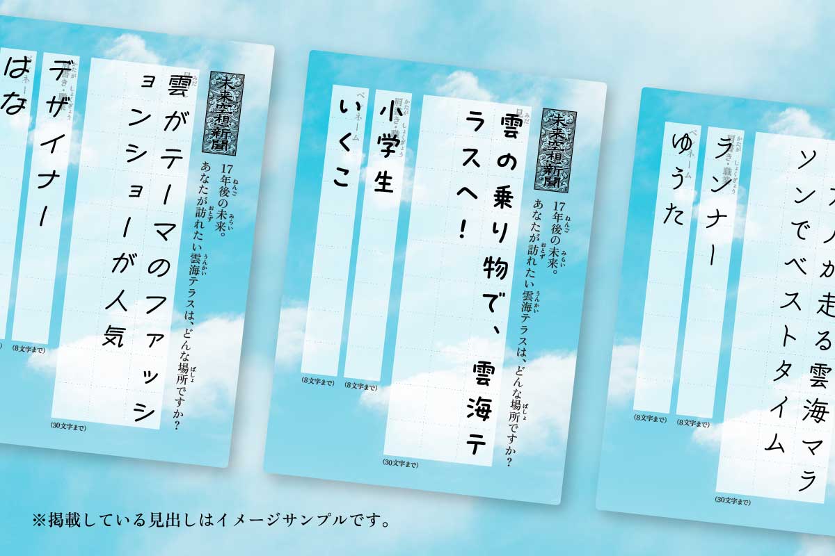 2025年9月18日(木)~24日(水)の期間、未来空想新聞2042製作委員会(朝日新聞社・パナソニック株式会社)と共同で、雲海テラスと未来空想新聞2042の特別企画、未来の雲海テラスを空想しよう。を開催します。本企画は、雲海テラスの20周年を記念し、雲海テラスに来場した方から未来の“見出し”を募集する企画です。未来の雲海テラスを一緒に考えてみませんか。