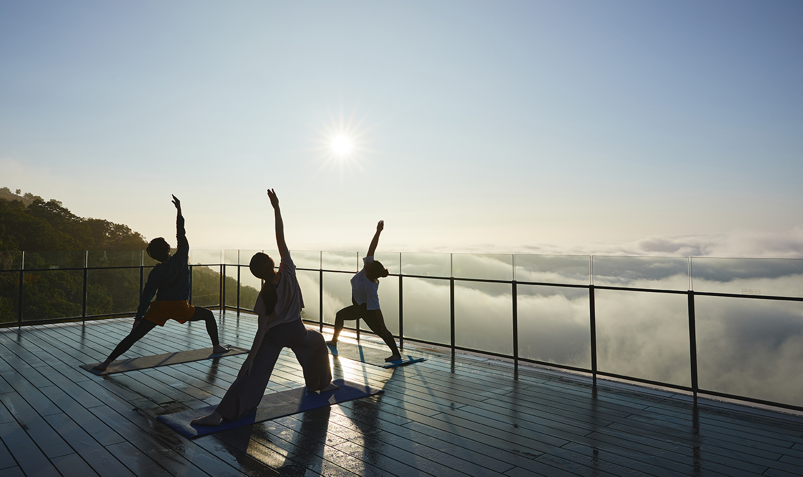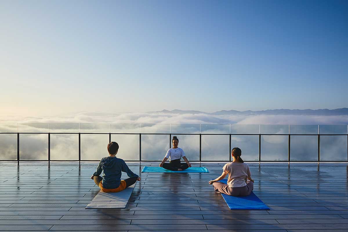 雲海テラスの絶景や雲尽くしの滞在を通して心身をリフレッシュする「雲海リトリートステイ」。早朝の雲海テラスでプライベートヨガを体験、雲モチーフの快眠グッズを備えた客室や、スパトリートメントで癒された後は、特別なディナーでリトリートを締めくくります。
