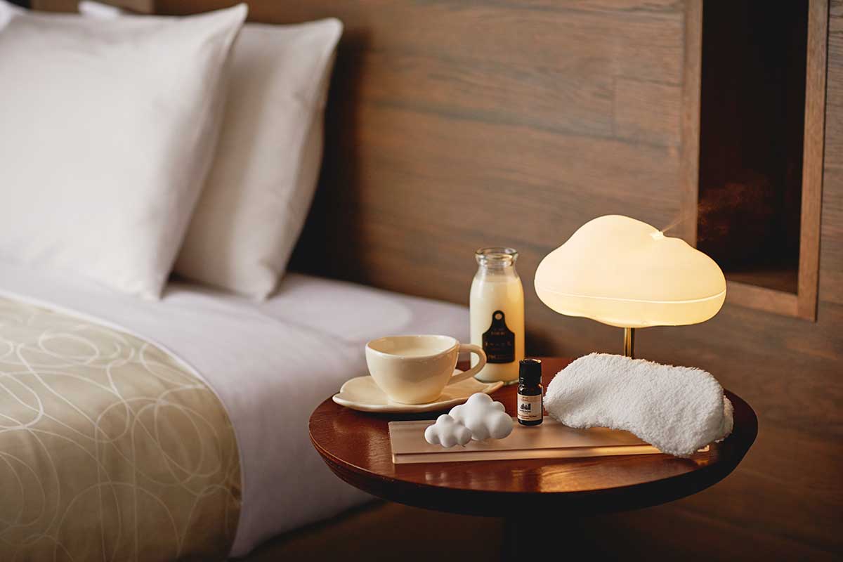 ご宿泊は落ち着いた雰囲気のデザインスイートツインルーム。雲アロマランプやアイマスクなど、プラン限定の快眠グッズが心地よい眠りへと誘います。おやすみ前には、夕方ころに搾乳されたトマム牛乳を使用した「ほんのりSWEET TOMAMU night milk」を飲むのがおすすめ。客室にはプライベートサウナと展望ジェットバスも完備しており、お好きな時間にリラックスできます。