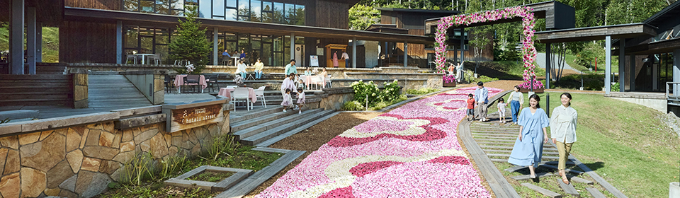 テラス席から全長160mの花咲く絨毯を眺めながら楽しむ