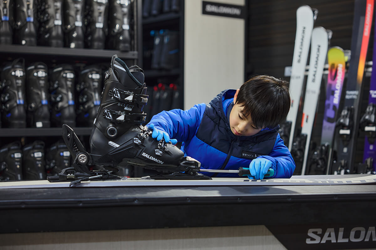 お子さまがスキー場にあるレンタルショップの仕事を体験できるアクティビティ。ゲストの板やストックをそろえたり、道具のメンテナンスを体験することができます。
