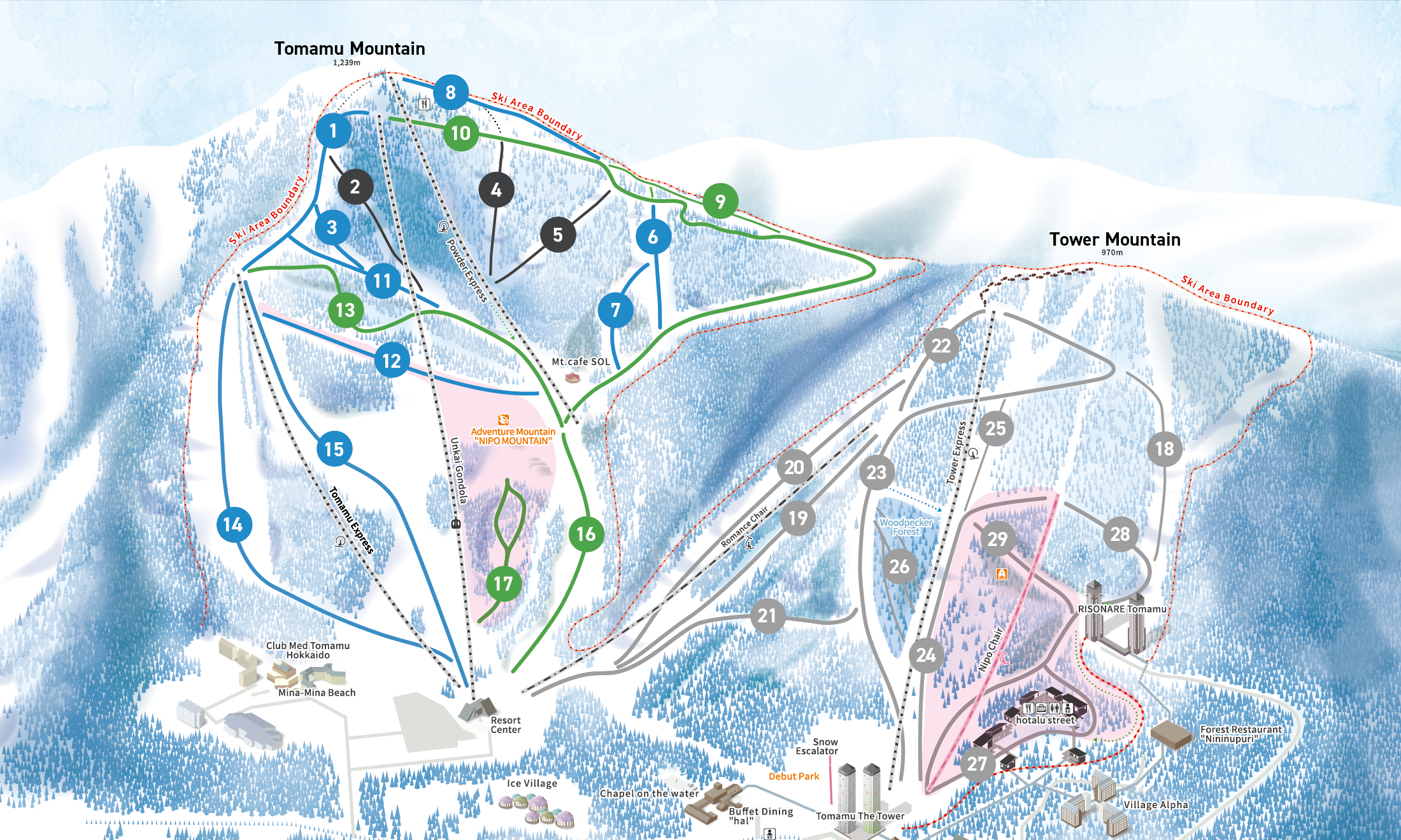 Nipo Chair를 타고 올라가서 이용하는 새로운 코스입니다. 초보자에서 초급자로 스텝업하기 좋은 코스입니다.