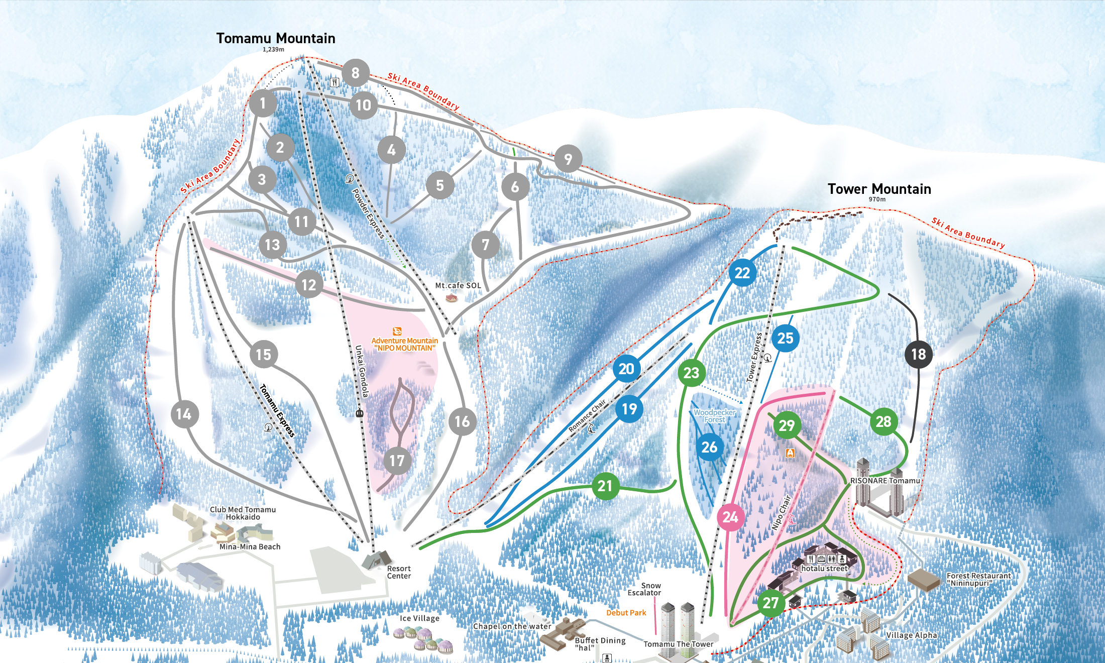 Tomamu Express를 타고 올라가서 이용하는 비압설 코스. 리조트 센터에 도착하면 자신이 미끄러져 내려온 스키자국을 볼 수도 있습니다.