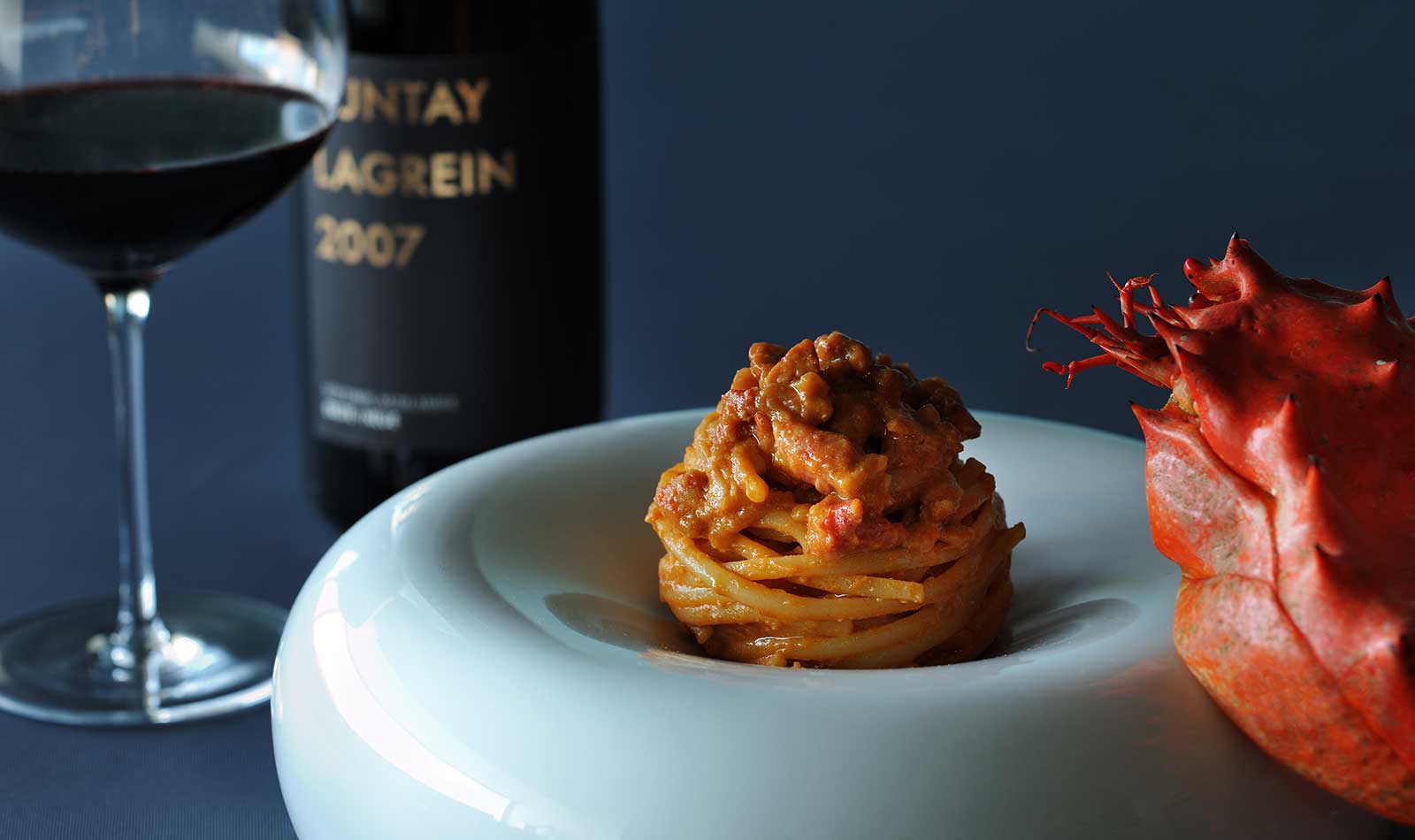 温製パスタには、バルサミコを思わせる熟成のニュアンスと円みのあるタンニンが特徴の「ラグレイン2007」を合わせます。この熟成感が甲殻類とトマトを凝縮したソースと合うことで、料理の味わいをより深く引き立てるペアリングです。