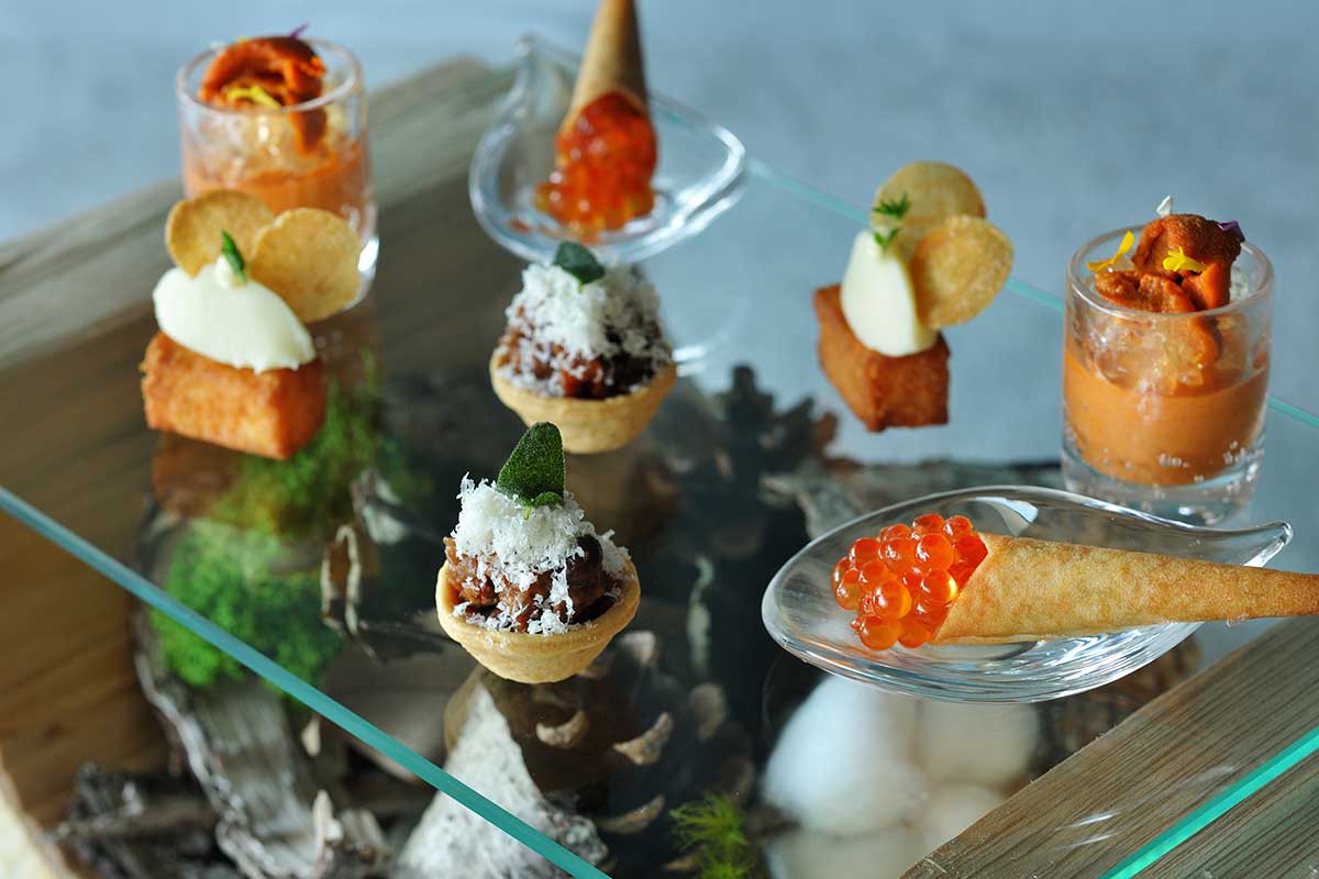 コースの始まりを飾る小前菜は、海と大地の恵みを味わえる華やかな4種類の料理。レモンと香草が香るサーモンのパテを詰め、イクラを贅沢に盛り付けたコルノ。澄んだトマトジュレに濃厚な雲丹を添えたパッパコルポモドーロなど、素材の魅力を引き出した料理が並びます。これらは北海道を代表する白樺の器に盛りつけられ、北海道の広大な大地の豊かさを感じさせます。